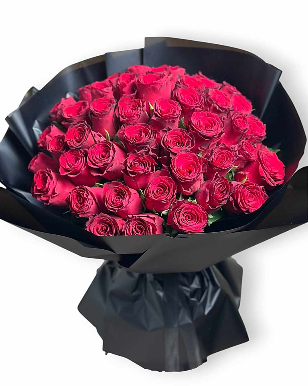 “41 Premium Gül” buketi, yoğun yaprak dokusuna ve dolgun başlara sahip seçme kırmızı güllerle hazırlanır. Modern siyah sargısı ve sade formu, bukete güçlü bir kontrast verir. Doğum günü, yıldönümü, evlilik teklifi veya özür dilemek için etkisi yüksek, zamansız bir seçimdir.