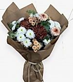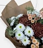 Amber Harvest, sonbaharın sakin tonlarını taşır. Dolgun bordo–karamel kasımpatılar, beyaz mini kasımpatı kümeleri ve mavi eryngium; doğal yeşillerle dengelenip kraft sargıyla tamamlanır. Teşekkür, tebrik ya da içten bir not için samimi ve fotojenik bir seçimdir.