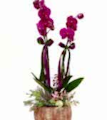 Dekoratif ithal saksıda özel üretim çift dallı fuşya orkidesi, yapay çiçekler, yosun ve 1 adet echeveria kullanılmıştır. Ürün bakım bilgileri siparişinizle birlikte gönderilecektir. Saksı çapı 22cm, yükseklik bitki dahil ortalama 60cm'dir