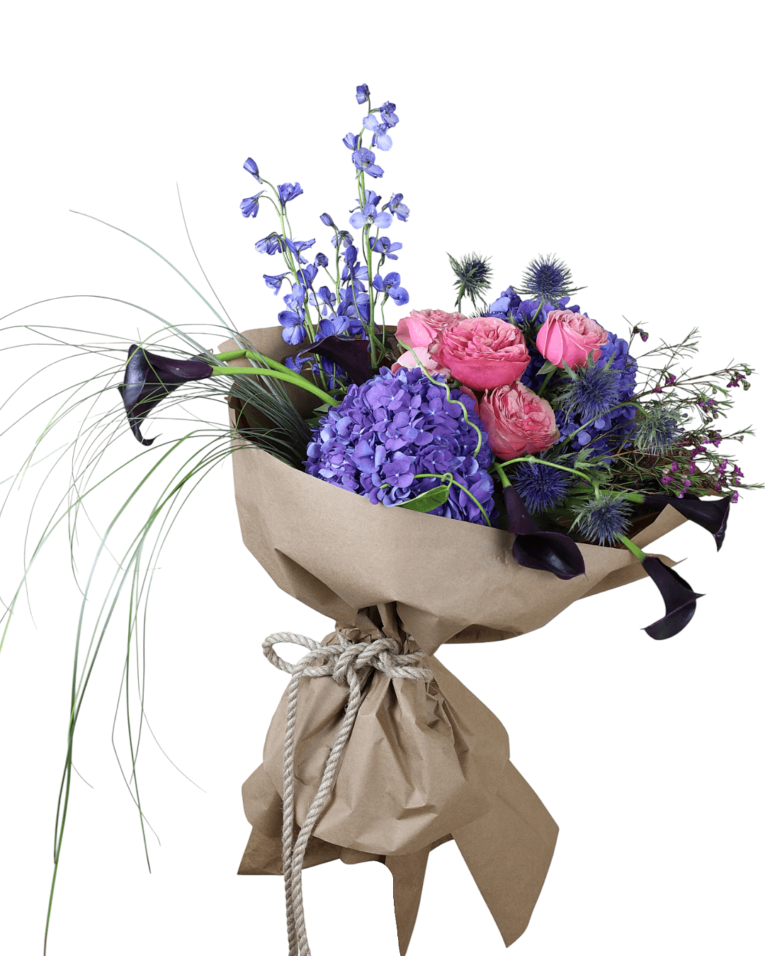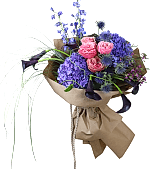 Mystic Violet Ortanca Buketi, morun gizemini ve pembe tonların enerjisini bir araya getiren zarif bir tasarımdır. Mavi-mor ortancalar, asil görünümüyle dikkat çekerken; pembe güller ve mor lavanta dokunuşları bukete romantik bir denge kazandırır.