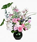 Orchid Meadow, zarif orkide başrollerdeyken pembe ve beyazın yumuşak geçişlerini modern yeşillerle buluşturur. Lilyum, gül, lisianthus, lale dokunuşları; okaliptüs, monstera ve çim formlarıyla havadar, heykelsi bir siluet oluşturur. Kutlama, tebrik, doğum günü ya da ofis karşılama masaları için dikkat çekici ve rafine bir seçimdir.