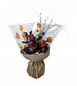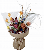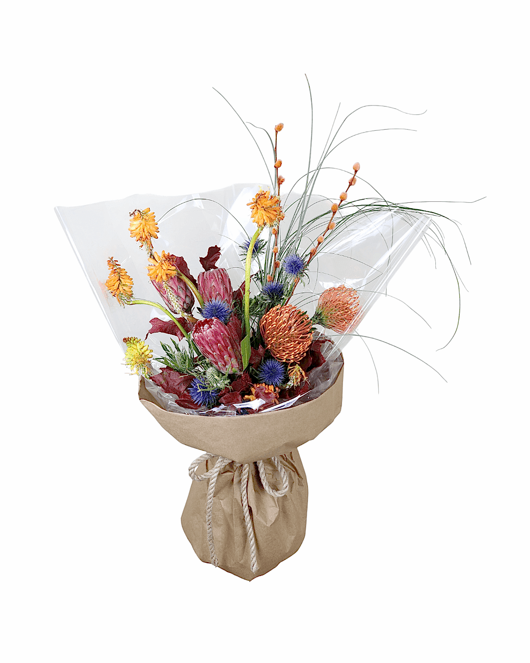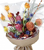 “Protea & Pincushion Alevi” doğrudan doğanın vahşi estetiğinden ilham alır. Pembe tonlu protea, turuncu pincushion, mor-mavi eryngium ve mevsimsel dokular bir araya gelerek sıcak, enerjik ve modern bir kompozisyon oluşturur. Zanaat kraft ambalajıyle doğal bir görünüm sunar; kutlama, tebrik, kurumsal hediye veya “fark yaratmak” istediğiniz her an için idealdir.