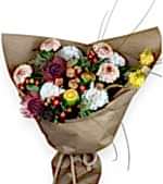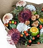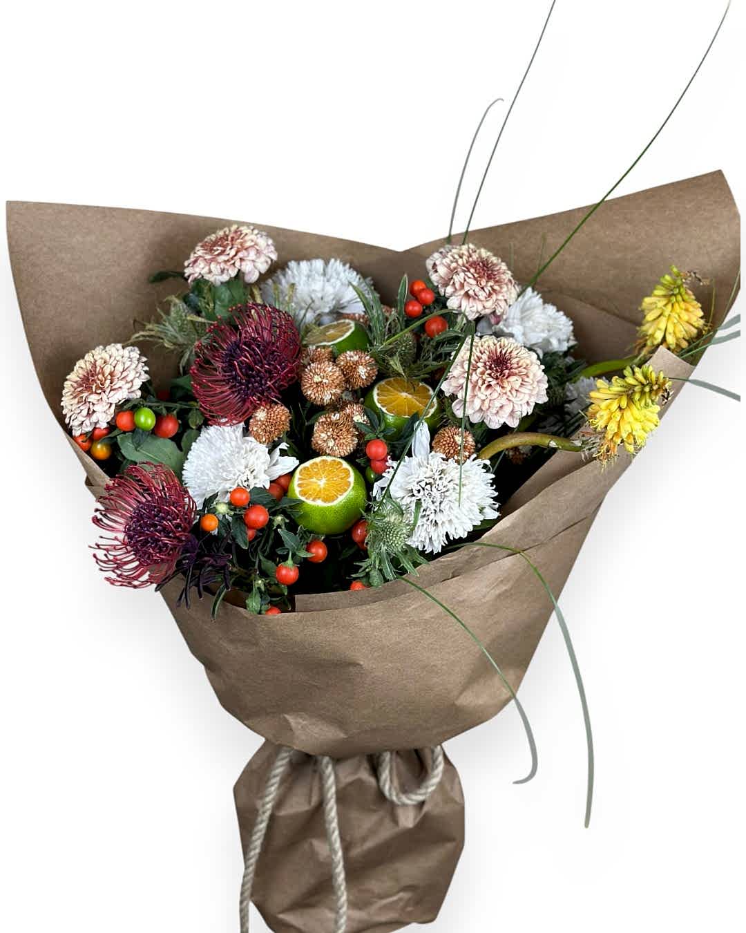 Spiced Citrus Harvest, sıcak baharat tonlarını taze narenciye dokunuşuyla buluşturur. Pincushion’ın heykelsi formu, kasımpatıların dolgun dokusu ve mavi eryngium’un kontrastı; hiperykum meyveleri, yeşiller ve yarım limon/mandalina dilimleriyle zenginleşir. Kutlama, tebrik ve “farklı olsun” diyenler için ideal, rustik–modern bir tasarım.